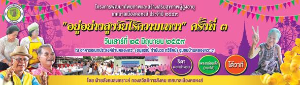 ฝ่ายสังคมสงเคราะห์ กองสวัสดิการสังคม ร่วมกับชมรมผู้สูงอายุเทศบาลเมืองคอหงส์ ได้กำหนดจัดกิจกรรมพัฒนาศักยภาพและสร้างเสริมสุขภาพผู้สูงอายุ “อยู่อย่างสูงวัยไร้ความเหงา” ครั้งที่ 3 ตามโครงการพัฒนาศักยภาพและสร้างเสริมสุขภาพผู้สูงอายุเทศบาลเมืองคอหงส์ ประจำปีงบประมาณ 2559 เพื่อให้ผู้สูงอายุได้มีการพัฒนาและสร้างเสริมสุขภาพกายและสุขภาพใจ ส่งเสริมให้ผู้สูงอายุมีการรวมกลุ่ม เกิดการแลกเปลี่ยนเรียนรู้ประสบการณ์ต่างๆ และสามารถนำมาปรับใช้ในการอยู่ร่วมกันในสังคมได้อย่างมีความสุข อีกทั้งเป็นการสร้างขวัญและกำลังใจให้ผู้สูงอายุได้มีทัศนคติที่ดีต่อการดูแลสุขภาพกายและสุขภาพใจให้แข็งแรงสมบูรณ์ เพื่อดำรงอยู่ในสังคมอย่างมีคุณค่า โดยกลุ่มเป้าหมายเป็นสมาชิกชมรมผู้สูงอายุเทศบาลเมืองคอหงส์ ผู้สูงอายุในเขตเทศบาลเมืองคอหงส์ และผู้ที่เกี่ยวข้อง จำนวน 400 คน ในวันเสาร์ที่ 25 มิถุนายน 2559  เวลา 13.00 น. ณ อาคารอเนกประสงค์บ้านคลองหวะ (อนุสรณ์ กำนันวร ทวีรัตน์) ชุมชนบ้านคลองหวะ 3