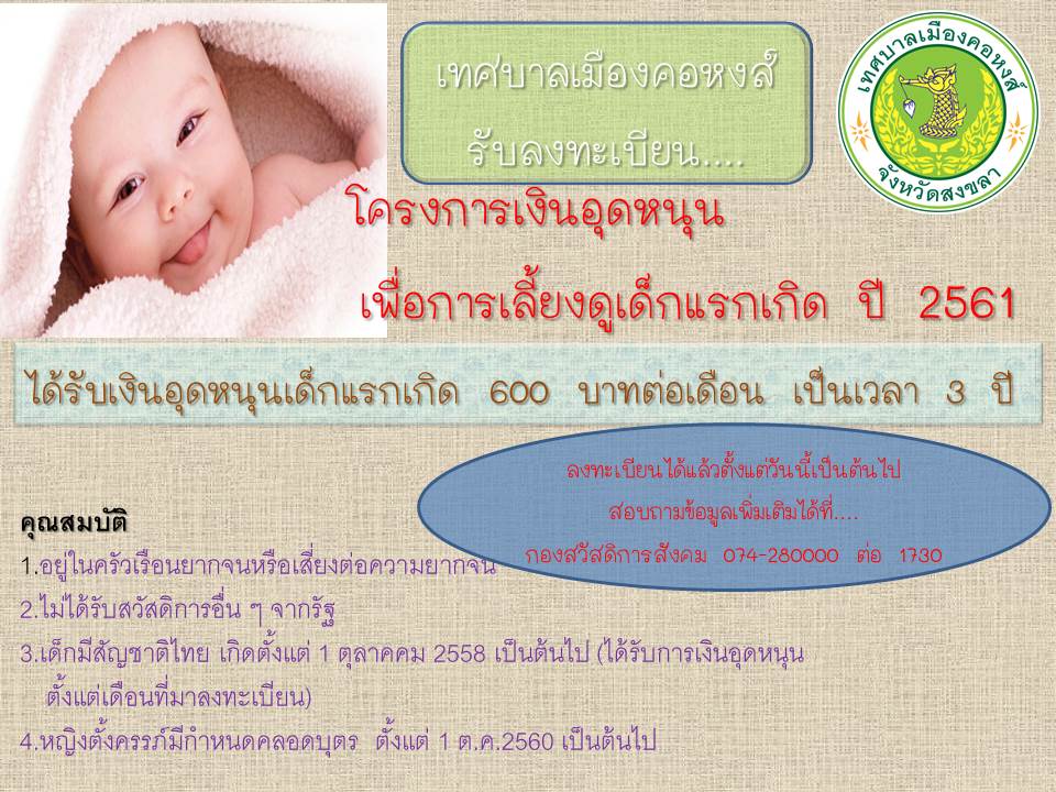 เรื่อง การลงทะเบียนขอรับสิทธิ์เงินอุดหนุนเพื่อการเลี้ยงดูเด็กแรกเกิด ประจำปีงบประมาณ พ.ศ.2561