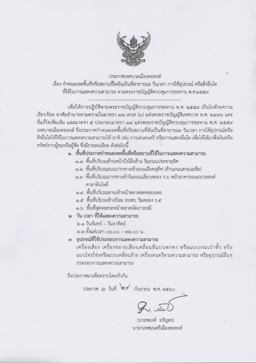 ประกาศเทศบาลเมืองคอหงส์ เรื่องกำหนดเขตพื้นที่หรือสถานที่่อันเป็นที่สาธารณะ วัน เวลา การใช้อุปกรณ์ หรือสิ่งอื่นใดที่ใช่ในการแสดงความสามารถ ตาม พ.ร.บ. ควบคุมการขอทาน พ.ศ.2559